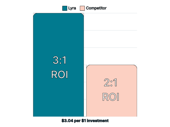 A study at a Fortune 500 company showed a savings of $3.04 per $1 investment. The result was independently confirmed by the AON report and is 50% higher than its competitors. The report by consulting firm AON analyzed insurance claims data from 30,000 people in the manufacturing, consumer goods and technology industries. It showed that Lyra participants incurred an average of 26% lower health care costs over four years.